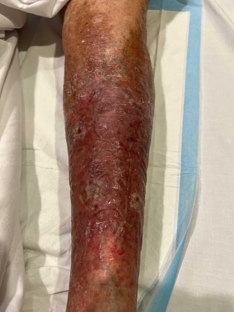 26 July 12 days as an inpatient with strict bed rest, elevation, dressings daily and most importantly compression bandaging thanks to the wonderful physio staff. Ready for discharge with Farrow wrap compression appliances applied